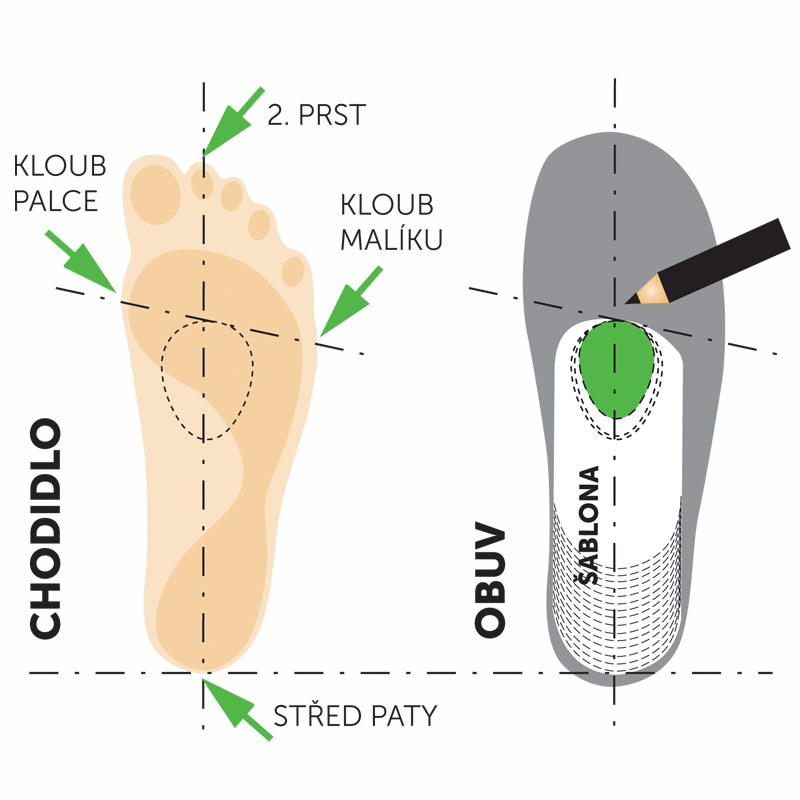 Vrchol srdíčka by měl ležet těsně za klouby záprstních kostí (metatarsů) na průsečíku podélné a příčné osy, nepatrně posunutý k zevní straně. Tento vrchol leží na podélné ose přibližně v 67 % délky krycí stélky obuvi (měřeno od paty). Směr průběhu srdíčka má odpovídat přirozenému tvaru nohy. Pro jednodušší aplikaci lze využít šablonu, která je na rubu příbalového letáku.